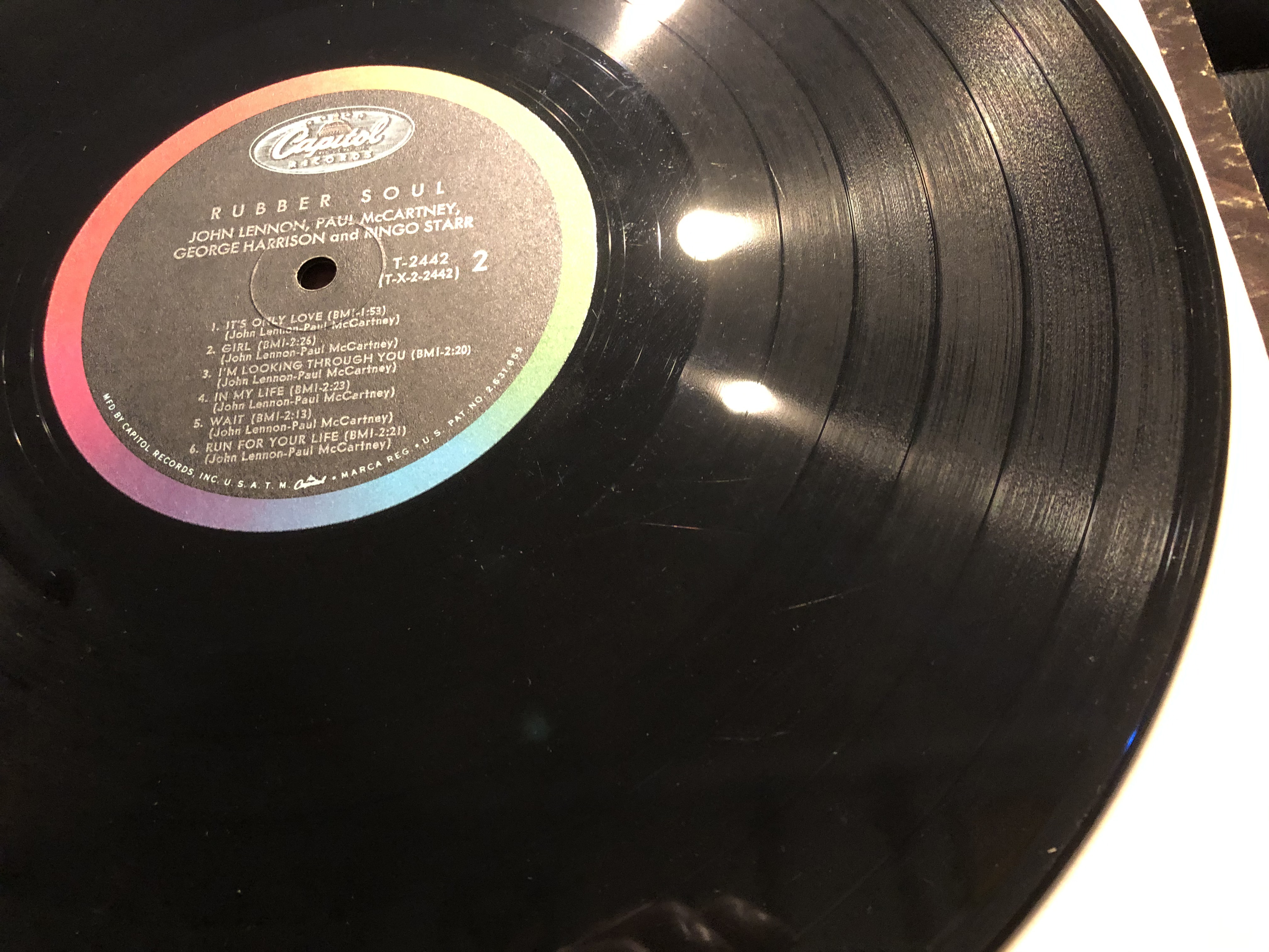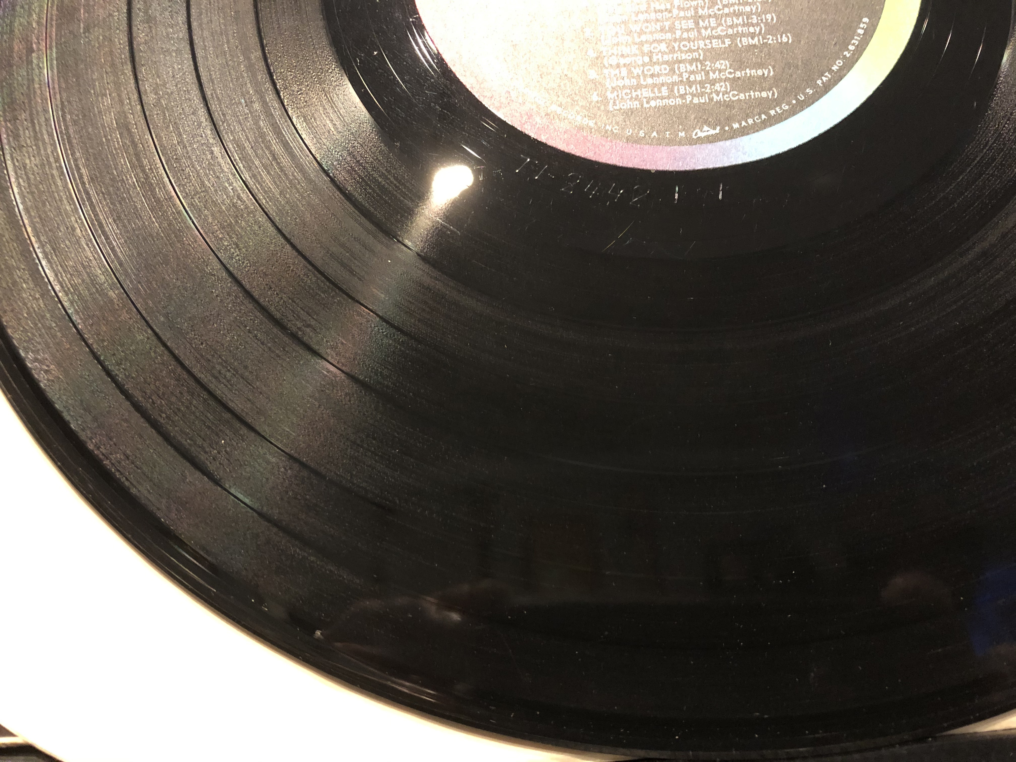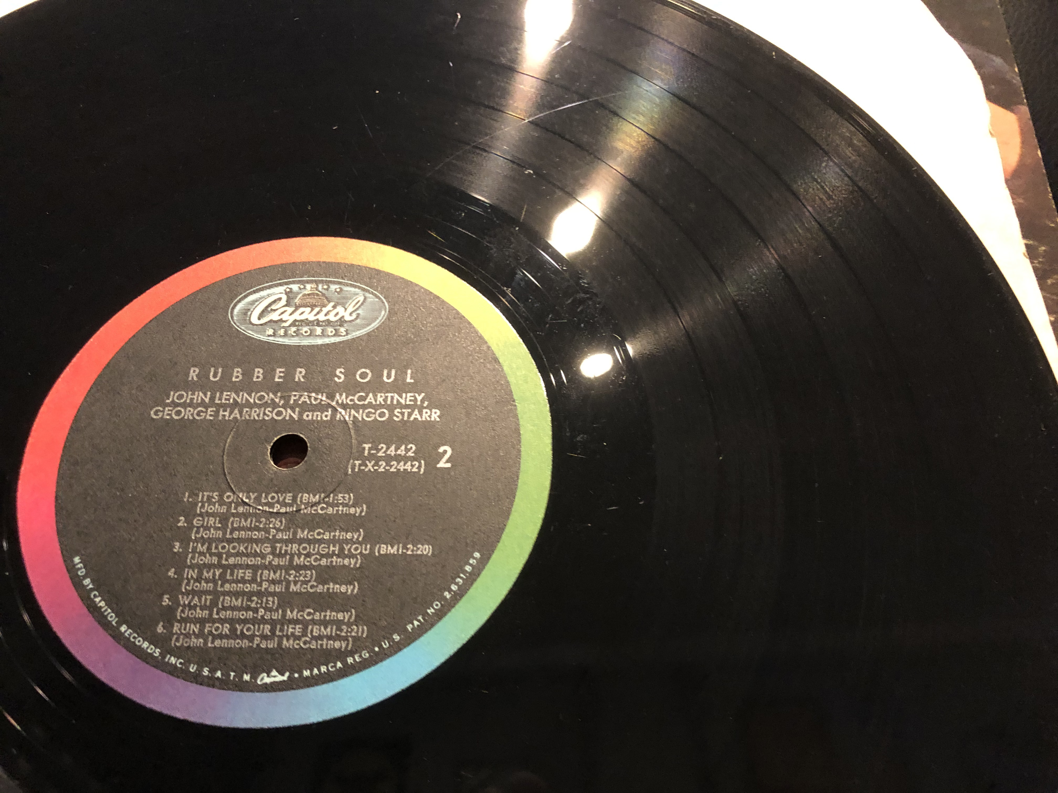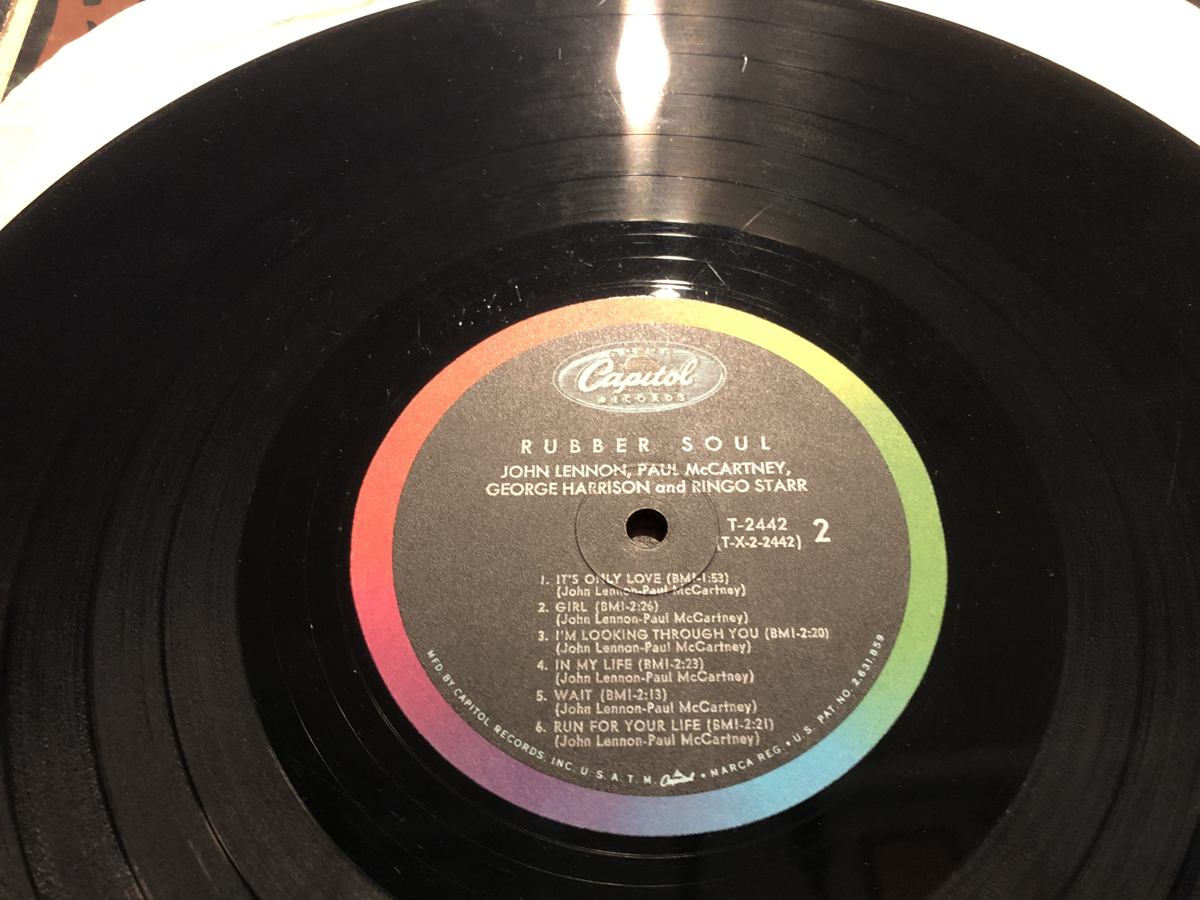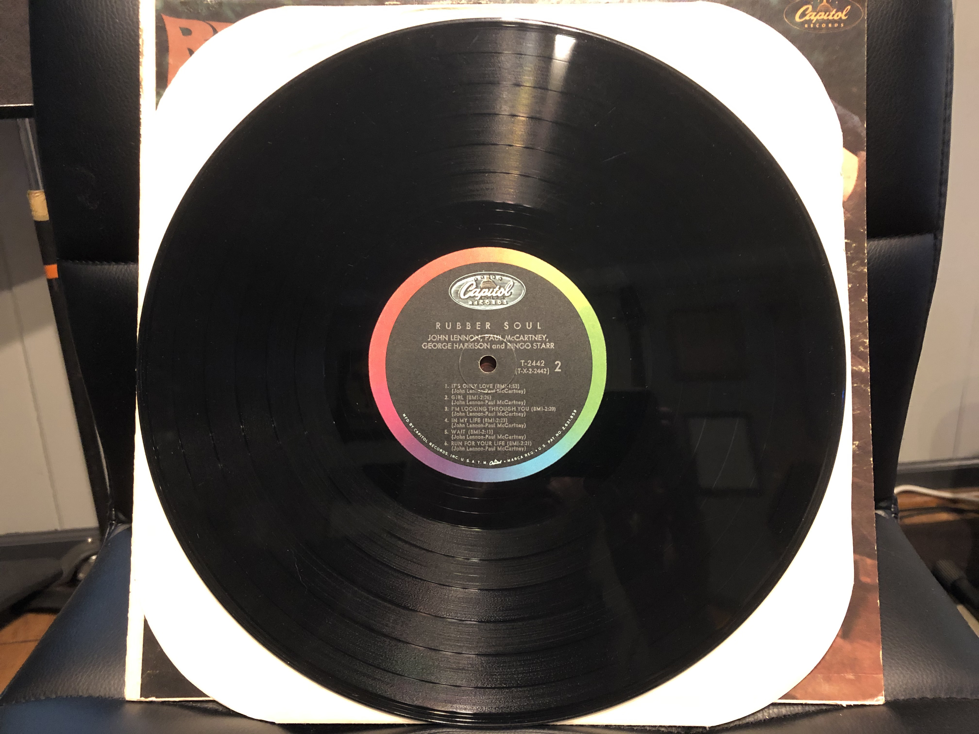 This is a pretty nice mono copy of the ninth US Beatles release on Capitol records. It's the 1st label, with the word "Beatles" not present on it, and with "Rubber Soul" wider than the Capitol dome logo right above it, and also with John and Paul's names on one line and George and Ringo's names on a line below it. The smaller-diameter circle around the spindle hole, plus the "P" at the end of the runout etchings, indicate that this is a Decca Pinckneyville pressing.