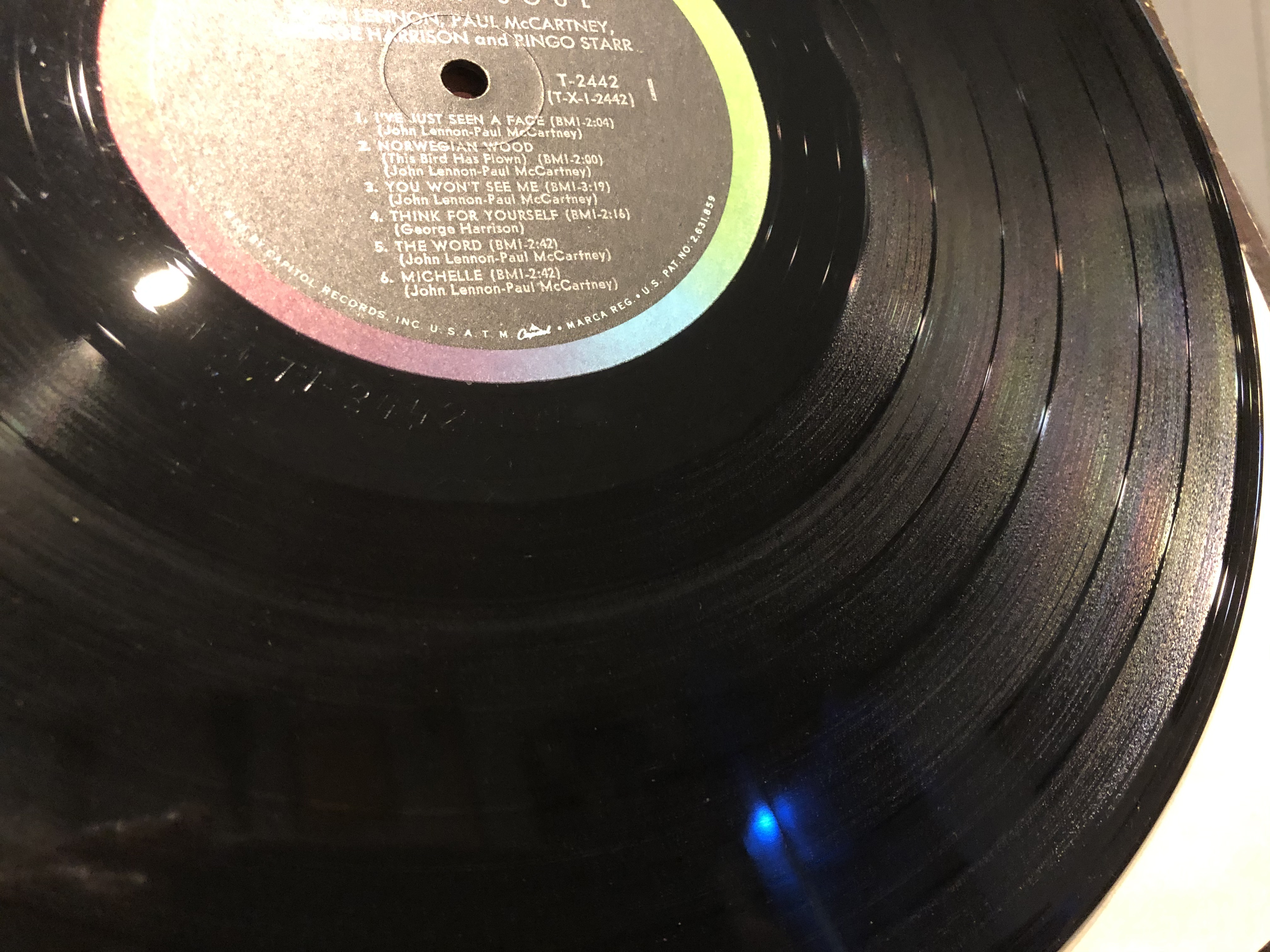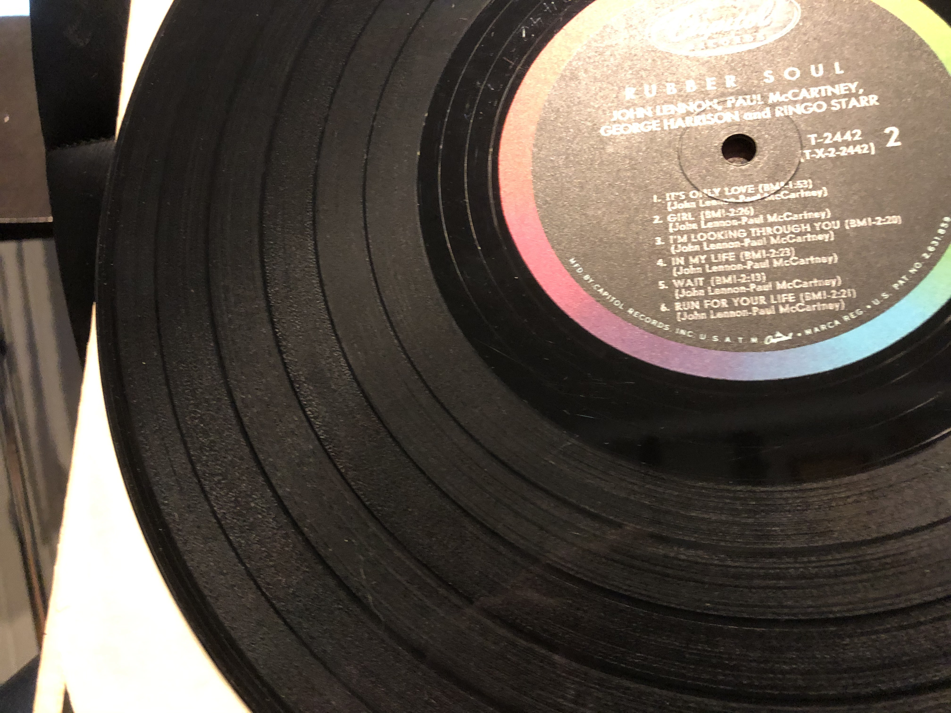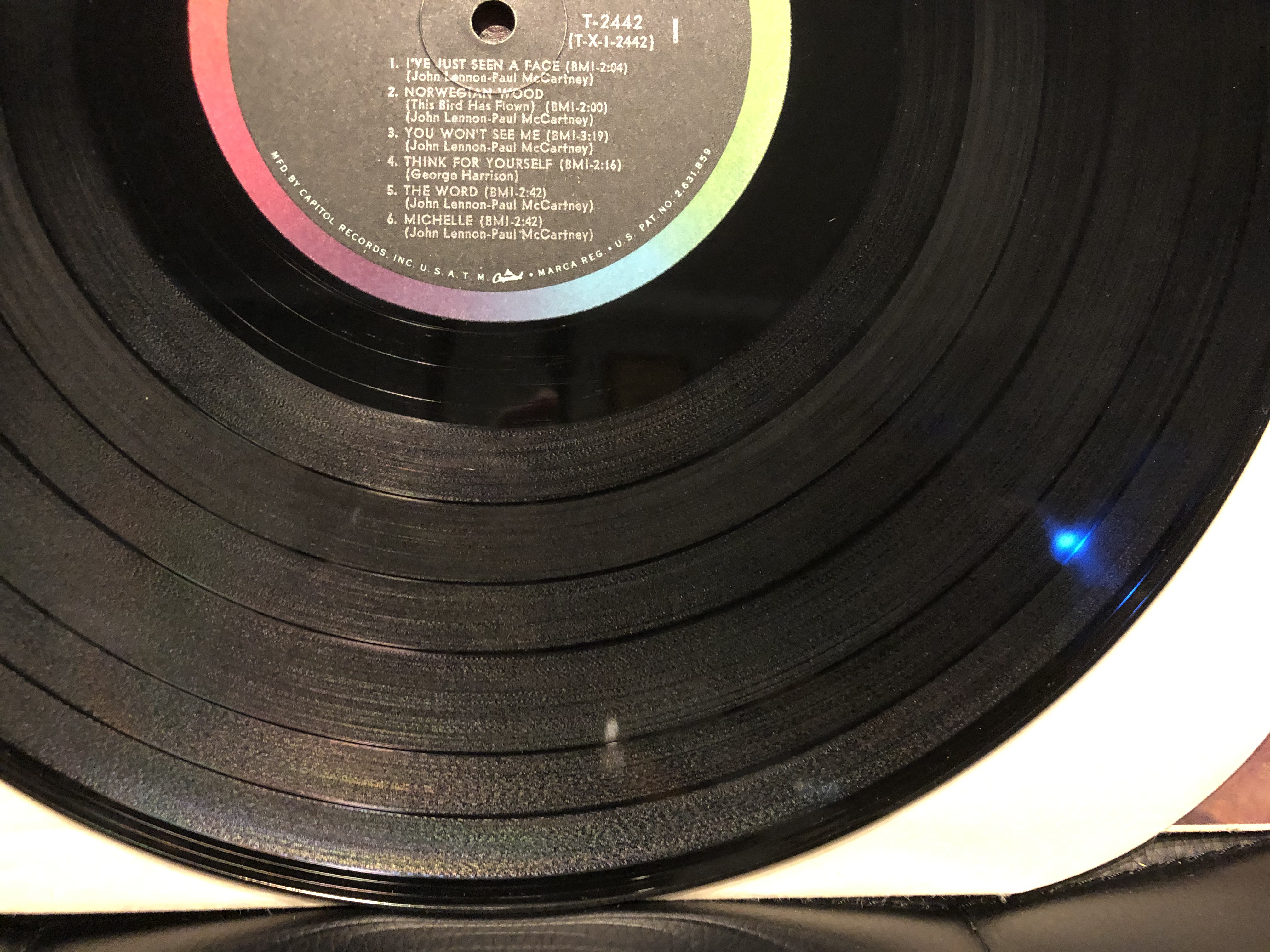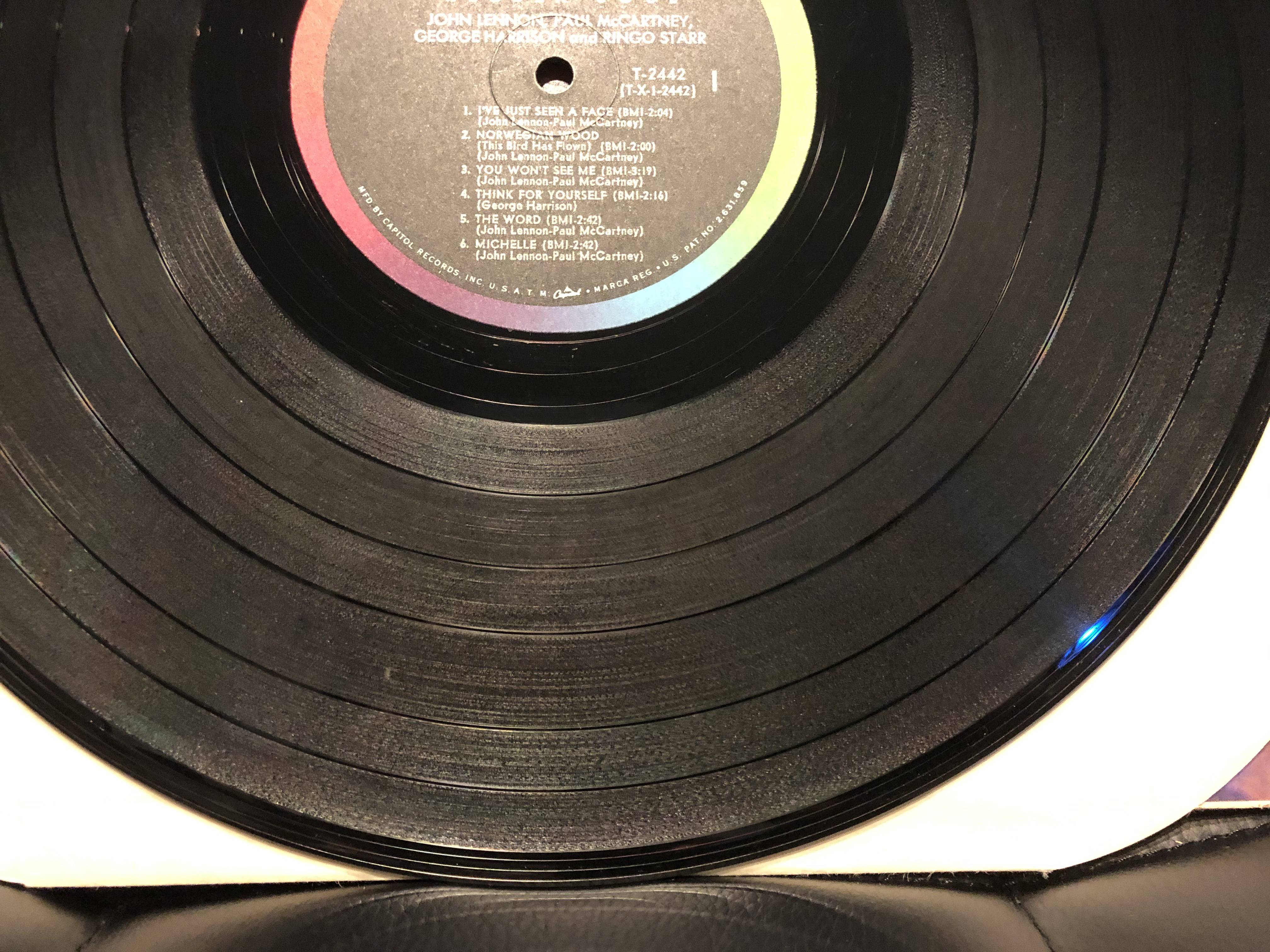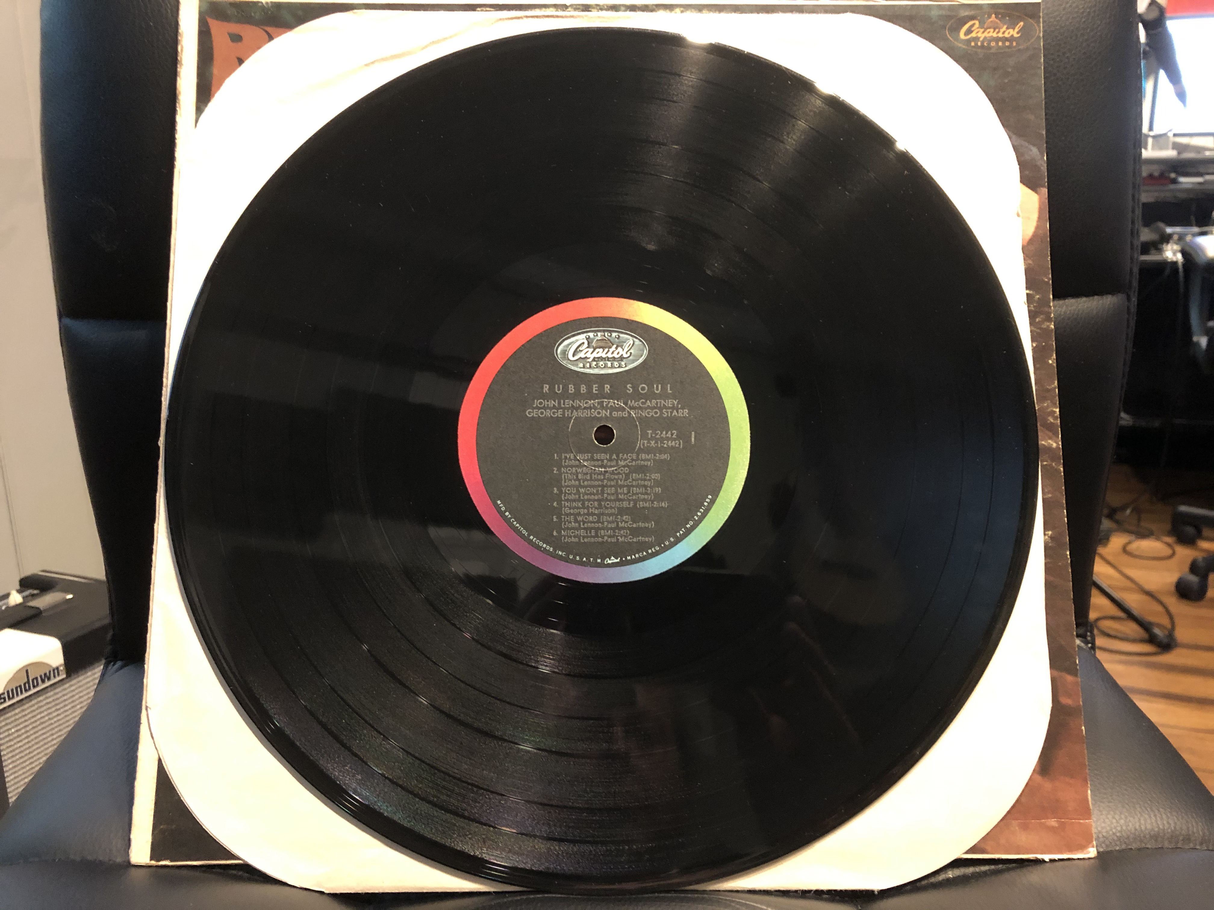 This is a pretty nice mono copy of the ninth US Beatles release on Capitol records. It's the 1st label, with the word "Beatles" not present on it, and with "Rubber Soul" wider than the Capitol dome logo right above it, and also with John and Paul's names on one line and George and Ringo's names on a line below it. The smaller-diameter circle around the spindle hole, plus the "P" at the end of the runout etchings, indicate that this is a Decca Pinckneyville pressing.
