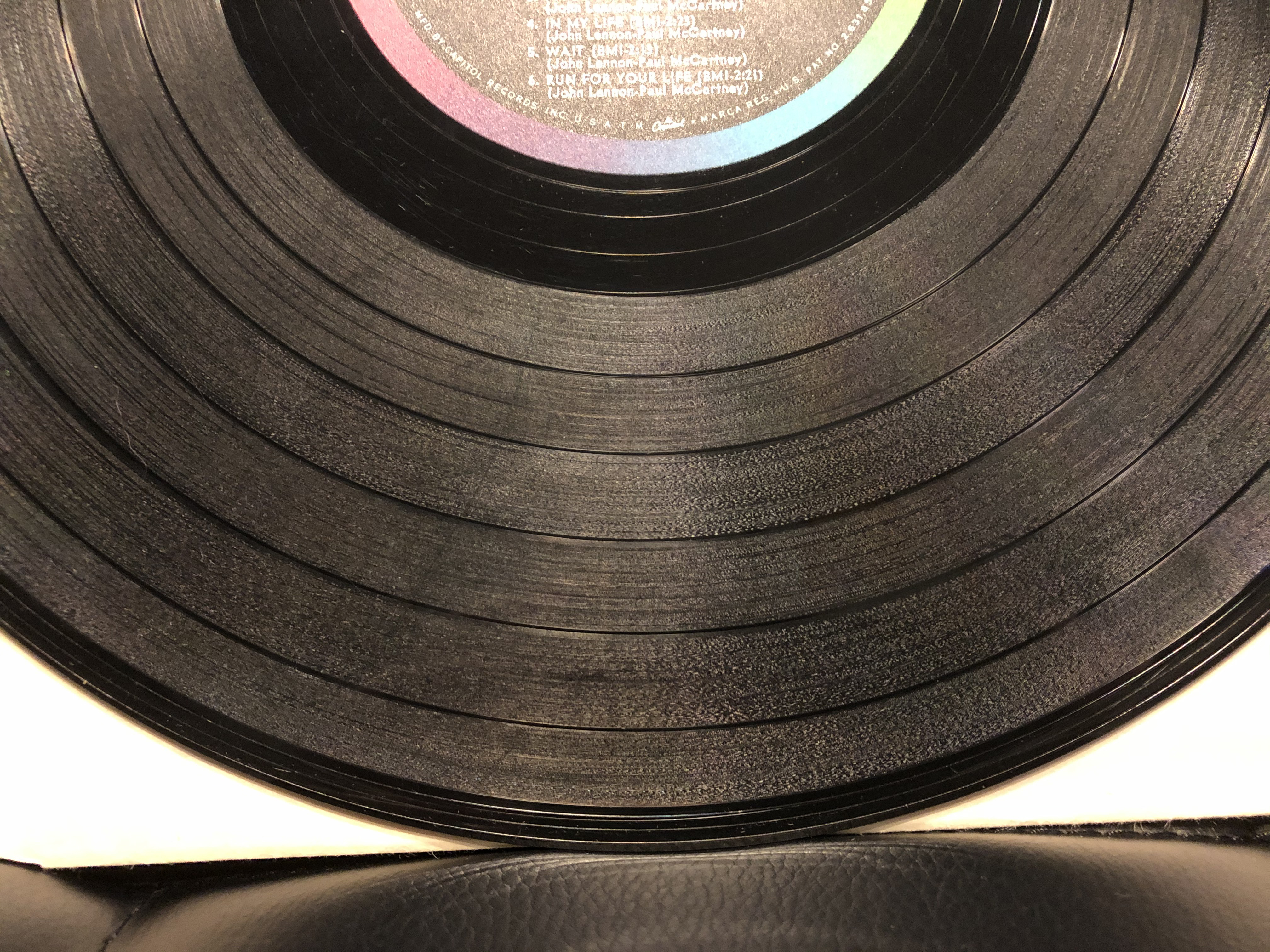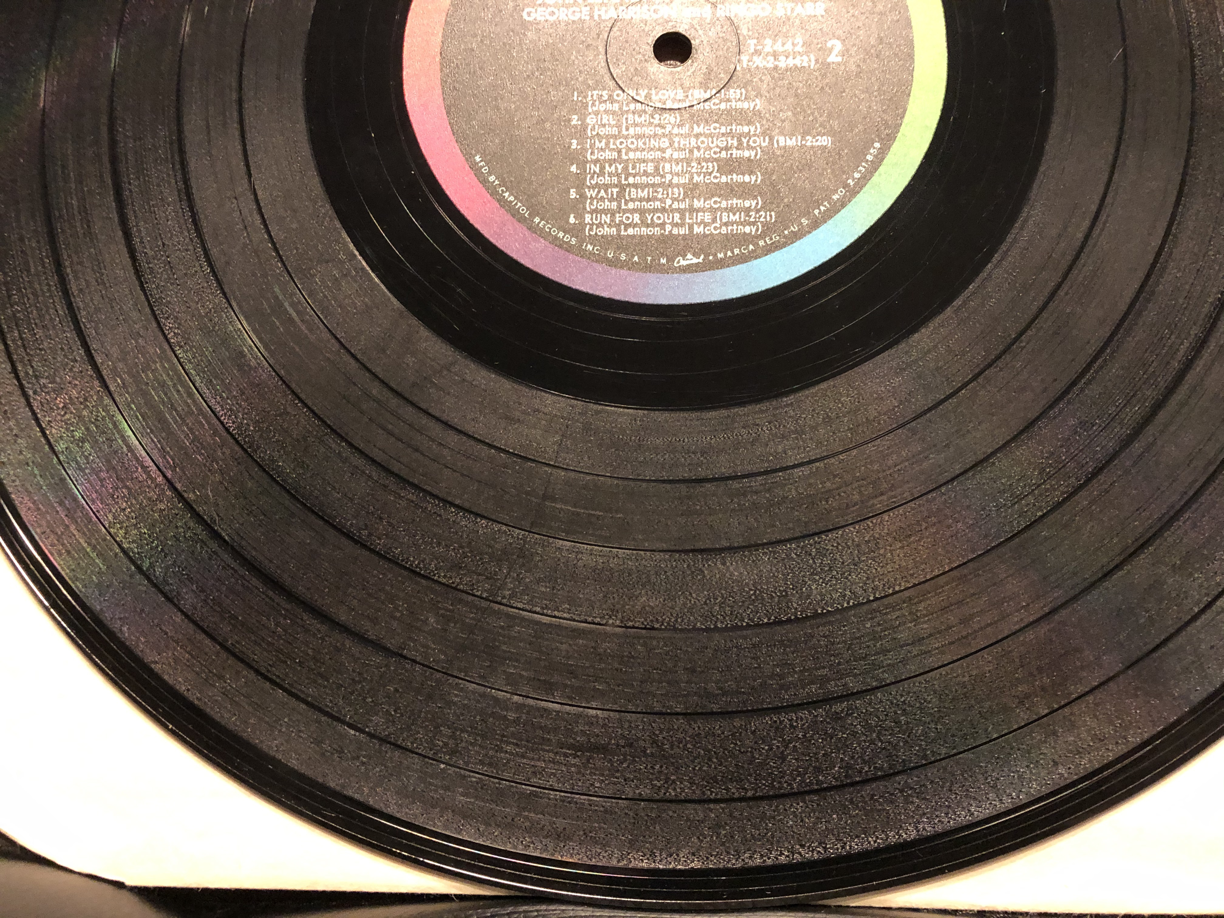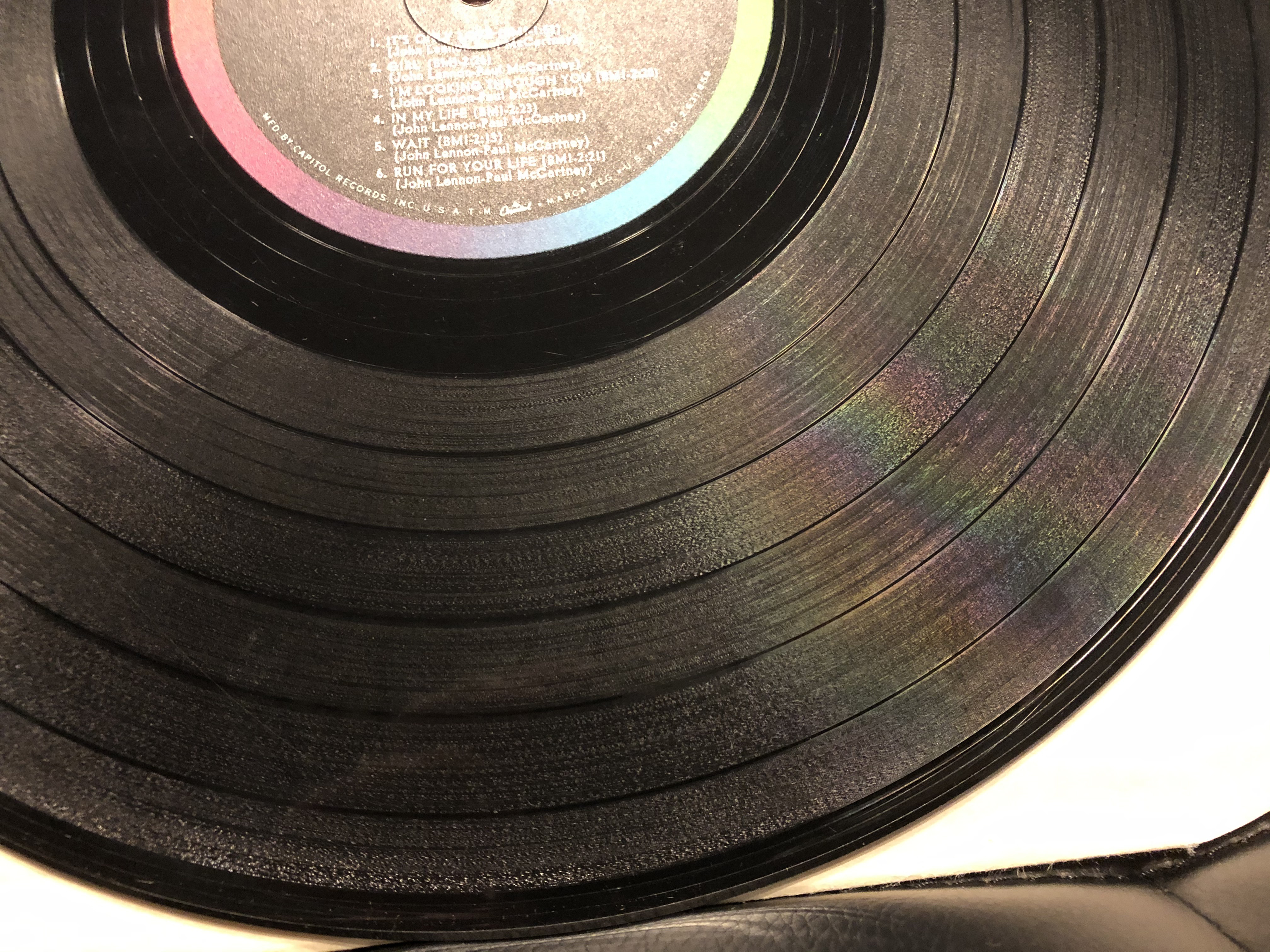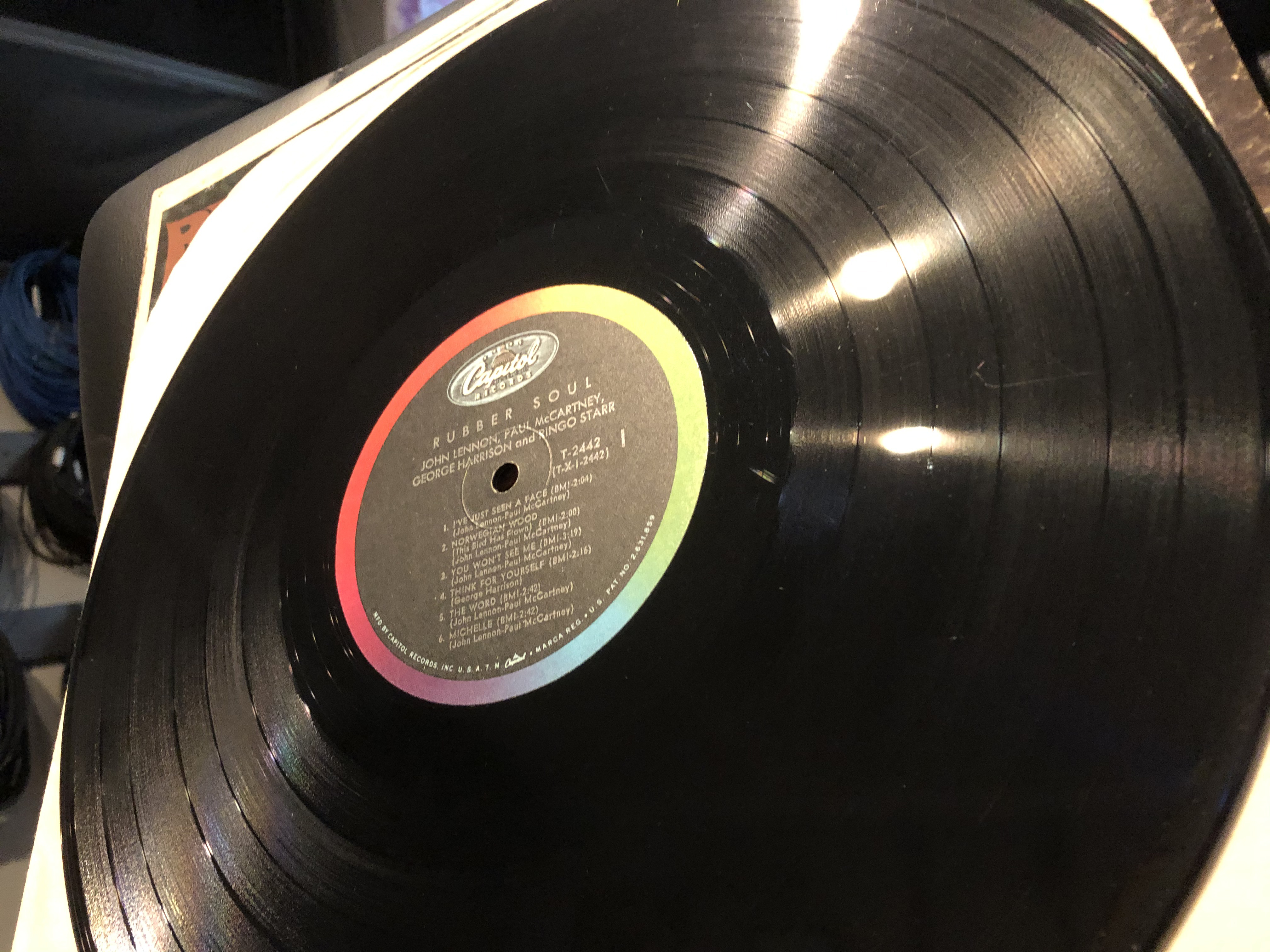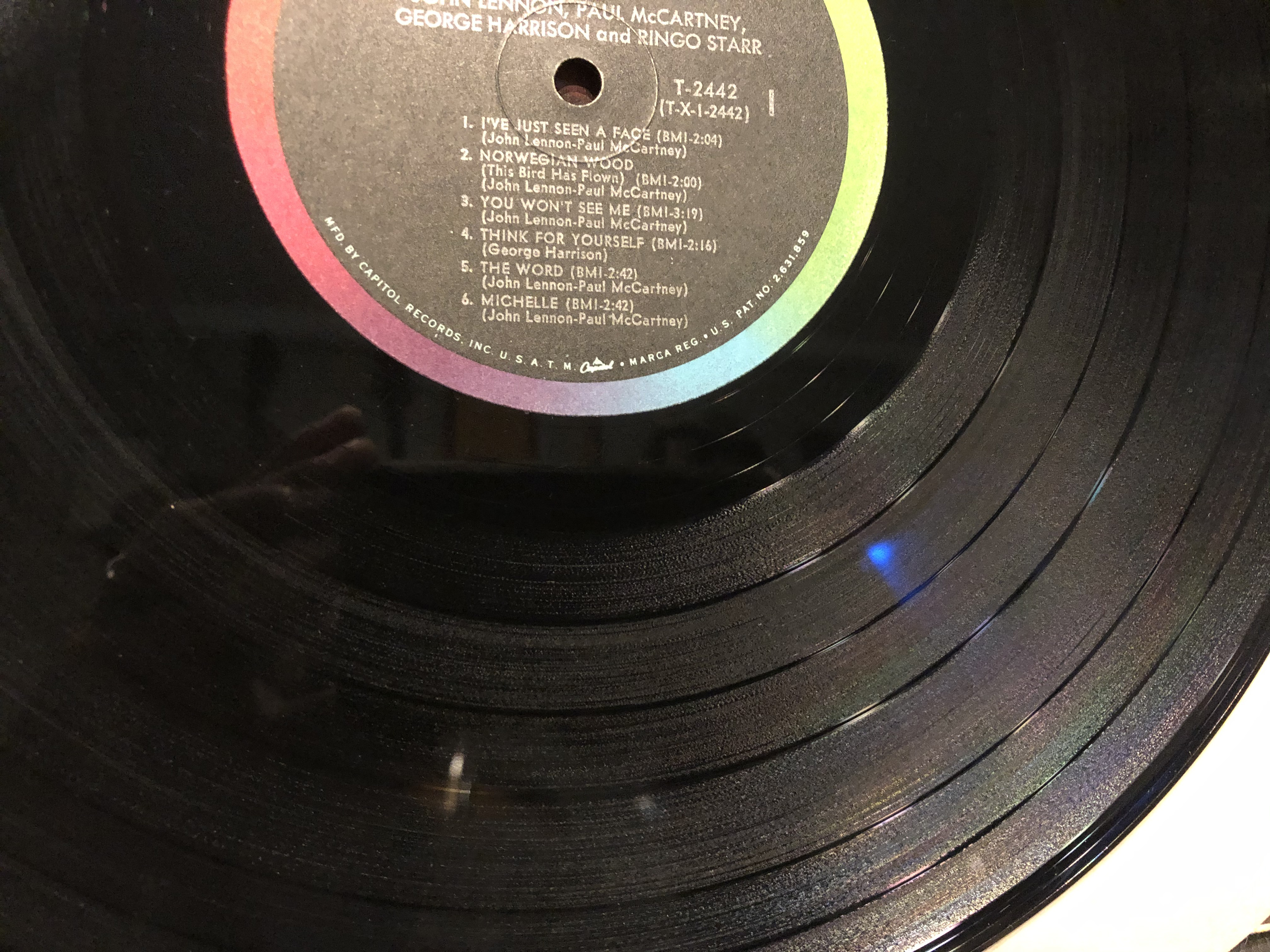 This is a pretty nice mono copy of the ninth US Beatles release on Capitol records. It's the 1st label, with the word "Beatles" not present on it, and with "Rubber Soul" wider than the Capitol dome logo right above it, and also with John and Paul's names on one line and George and Ringo's names on a line below it. The smaller-diameter circle around the spindle hole, plus the "P" at the end of the runout etchings, indicate that this is a Decca Pinckneyville pressing.