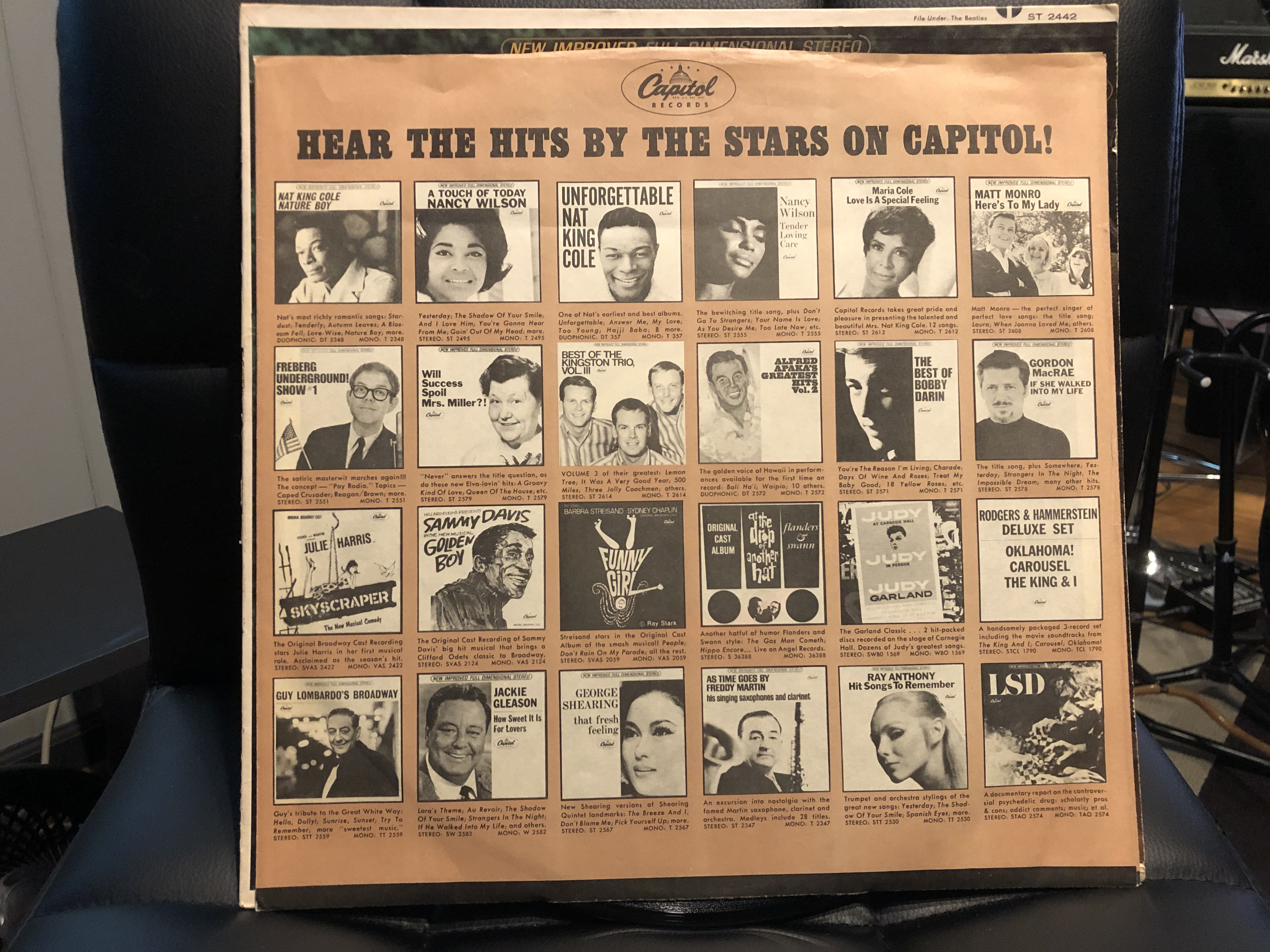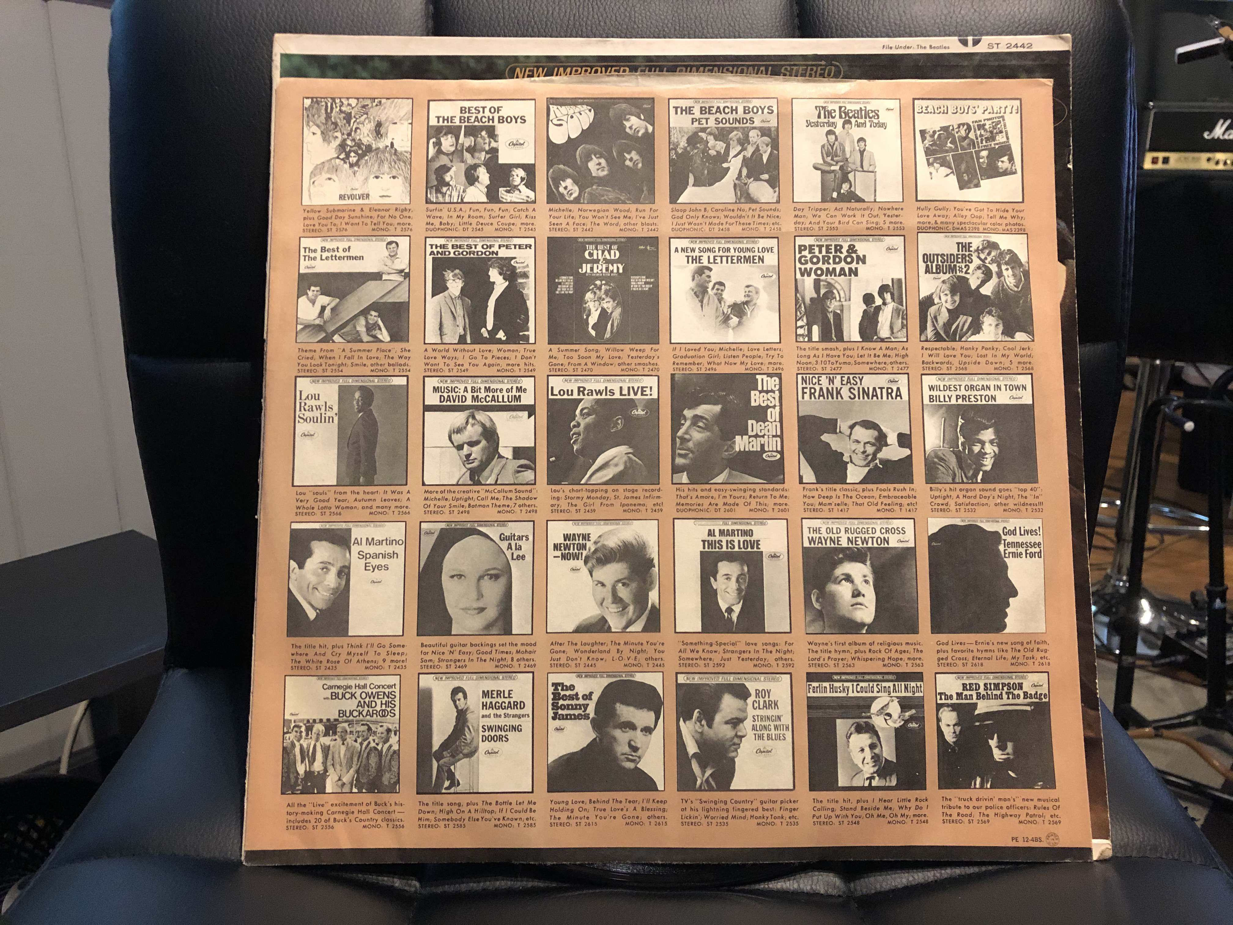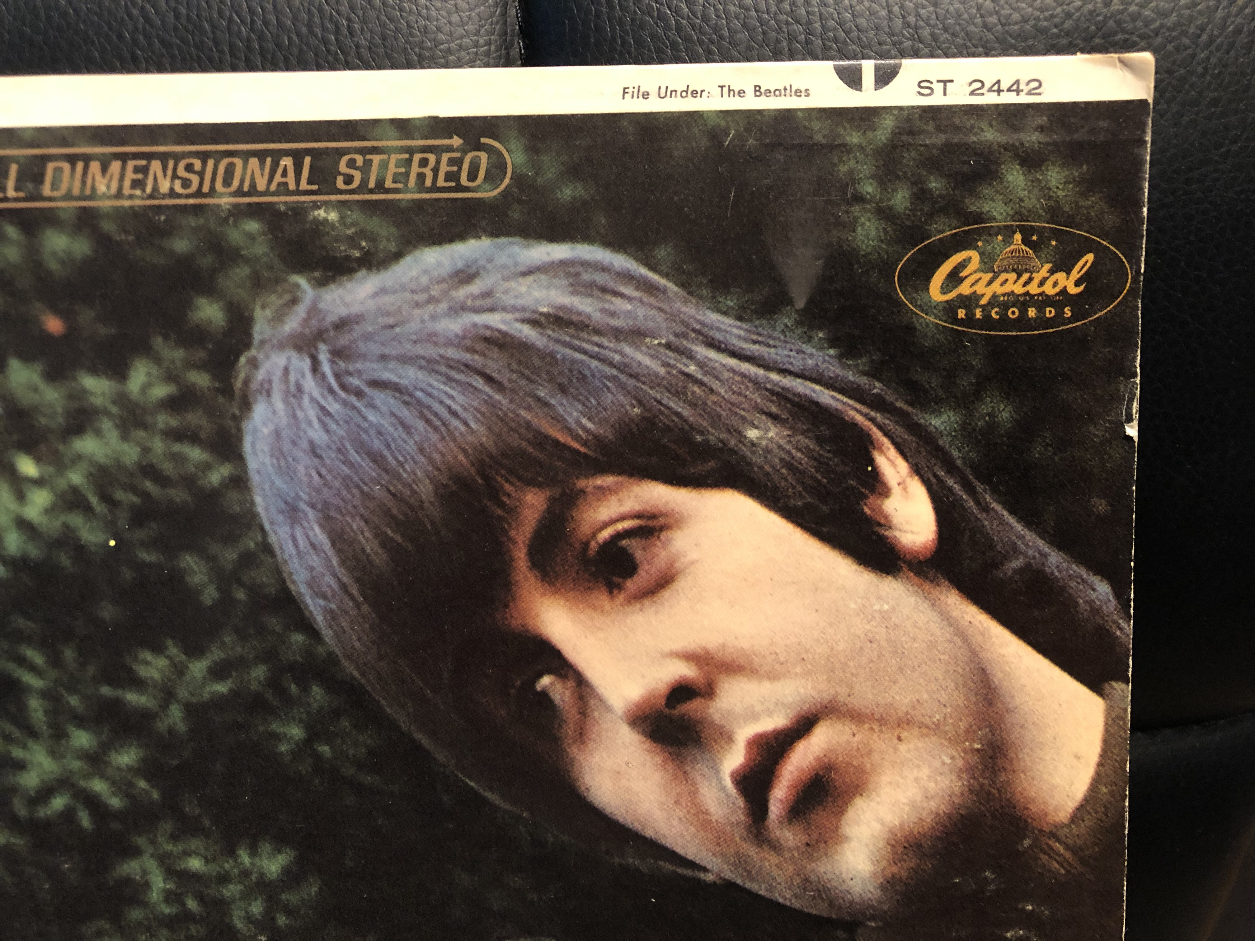 This is a pretty nice stereo copy of the ninth US Beatles release on Capitol records. This copy does NOT have "subsidiary" on the label; the jacket would be a VG+ or even VG++ if not for a couple of minor wear issues (all of which are visible in the pictures); the jacket has the ''New Improved'' caption in brown inside the picture, and it has a ''File Under'' caption in the top border. This label variation has both the individual names and the group's name, and the ''Stereo'' caption reaches over the tracklisting.